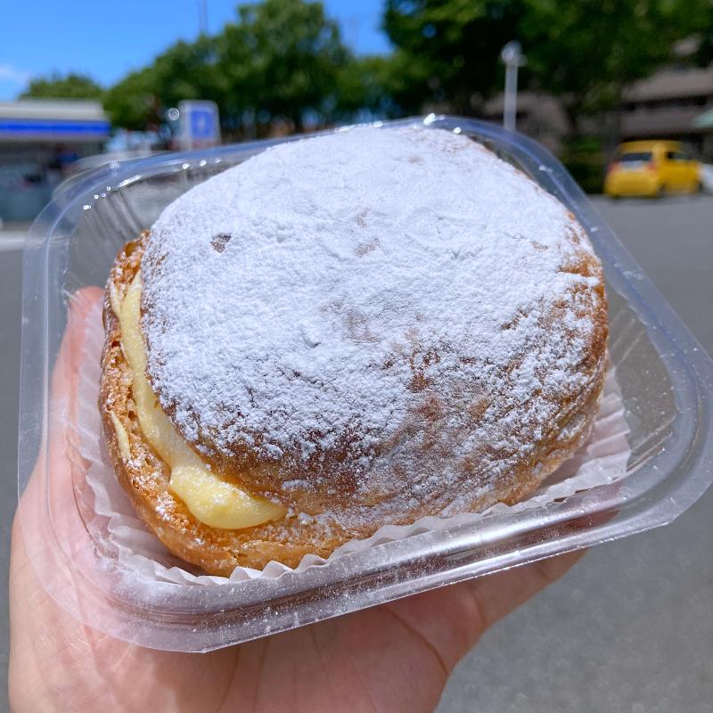 クロワッサンとブリオッシュの中間みたいな生地。表面には粉砂糖。たっぷり挟まったカスタードクリームが濃厚。このシュークリームはおいしい。