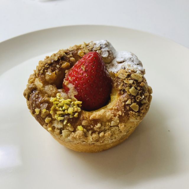 自家製カスタードクリームとキャラメルクリームの上に、イチゴが乗ってます。見た目もかわいい - バゲット・ショコラ 280円