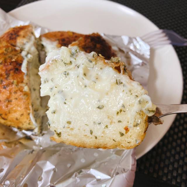 丸パンに十字に切れ目を入れて、バターをたっぷり染み込ませて、ガーリック、クリームチーズ、はちみつ、刻んだたまねぎも入っていました。