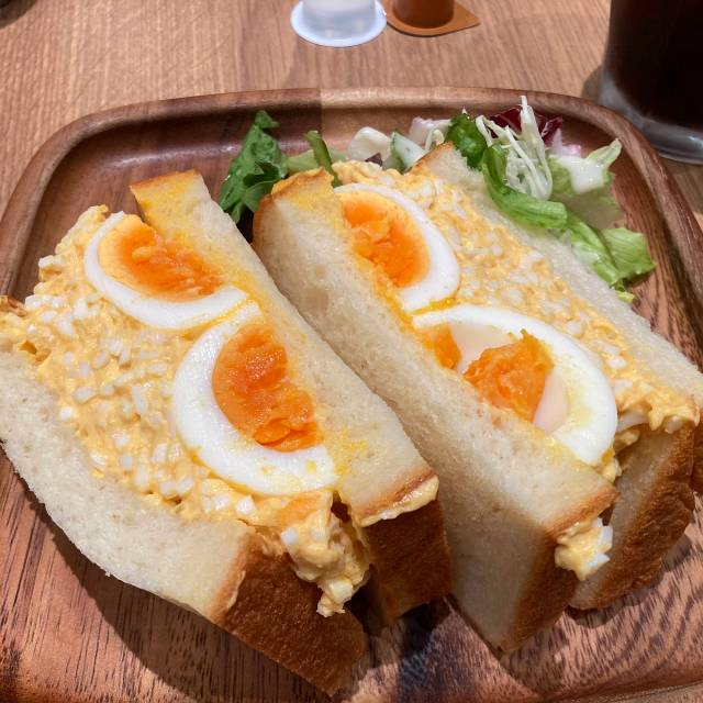 奥久慈卵のたまごサンドとアイスコーヒーを注文。まずパン生地は柔らかくてもちもち。バサついてなくて甘みもあって美味しい。