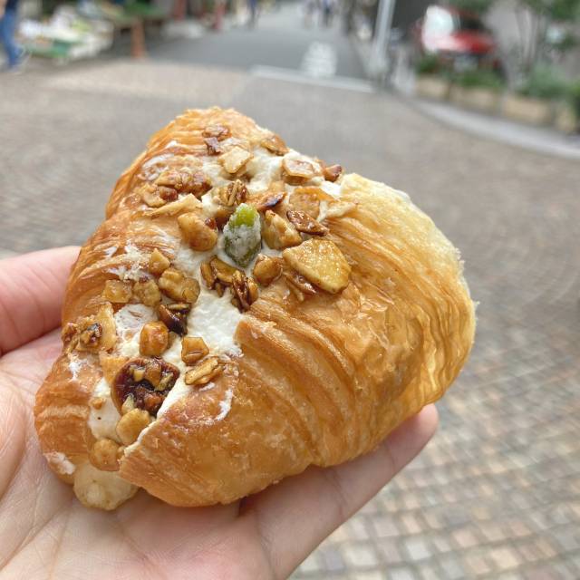 純生クリームをサンドして、表面にキャラメリゼしたナッツを散りばめて凍らせたマリトッツォ風クロワッサン。軽めのアイスとナッツの相性がグッド。