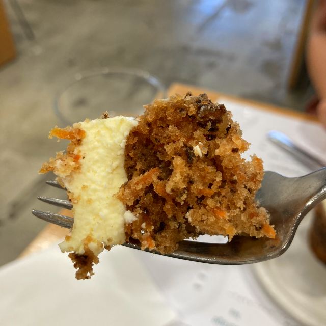独特のビジュアルで塔のような出立ち。いい感じにしっとりしていて生地の端まで固いところがなくニッキ感があります。くるみは小ぶりで満遍なく生地に混ざっていて、甘さはちょうどよく、これは文句なしに美味しい。上のクリームチーズフロスティは濃厚で、これだけでもお菓子になりそうなくらいではあるけど、下の部分と一緒に食べるとやっぱりバランスがいいと思い出させてくれます。