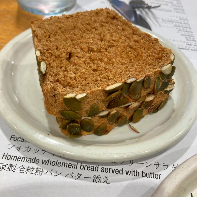表面にひまわりの種がぎっしりのorganic wholemeal breadで、それ程酸味なく食べやすく噛み締めると味わい深いパンでした。かぼちゃの種のアクセントが良い感じ。バターもクリーミー。