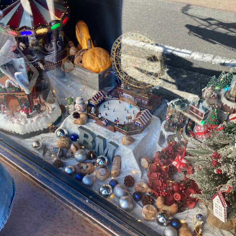 ちょっと写真が反射してしまって見づらいですが、ドア横のガラス越しに、冬らしいディスプレイがされていました。