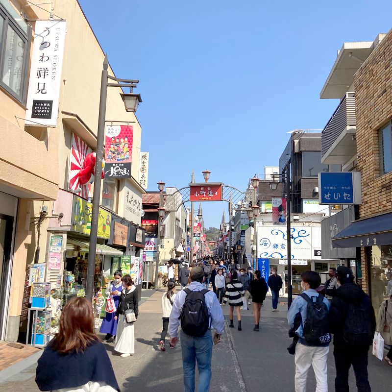 鎌倉駅から徒歩5〜6分ほど。東口から降りて、小町通りを進んで行きます。晴天の鎌倉、散歩日和。早咲きの桜が咲いてました。