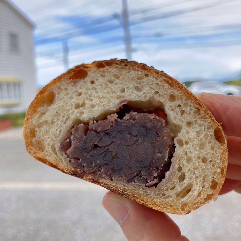 自家製小麦の全粒粉を30%使用した生地の中に北海道小麦のつぶあん。小ぶりだけどクラストが厚めでしっかりとした噛みごたえ。甘さ控えめのつぶあんがほっくり幸せ。黒ゴマも香ばしい。