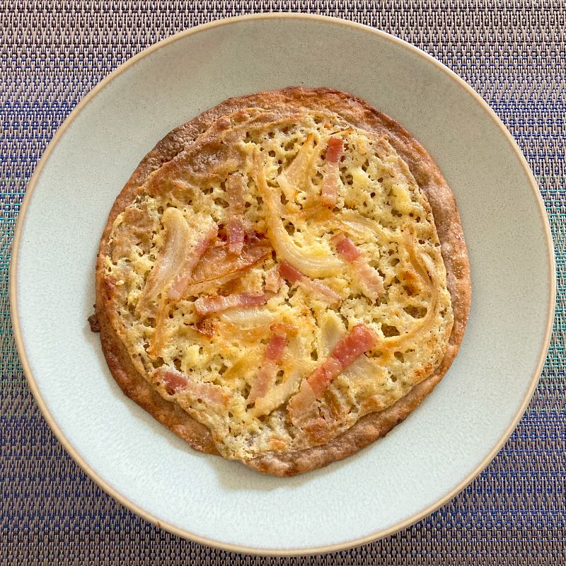 フランス北東部・アルザス地方の薄焼きピザ、タルトフランベ。そば粉の生地にフロマージュブランとわさびを使用。外周はバリっと硬め。そばとわさびの風味、極薄の生地に甘いたまねぎとベーコンが良い。わさびの辛みは控えめでした。