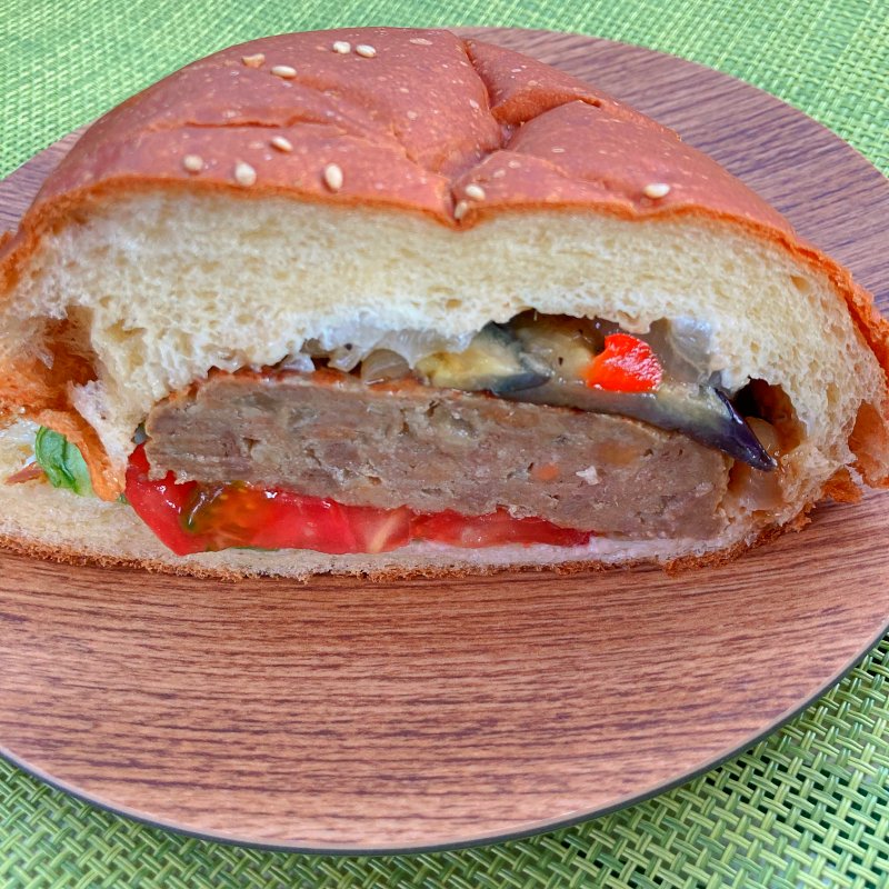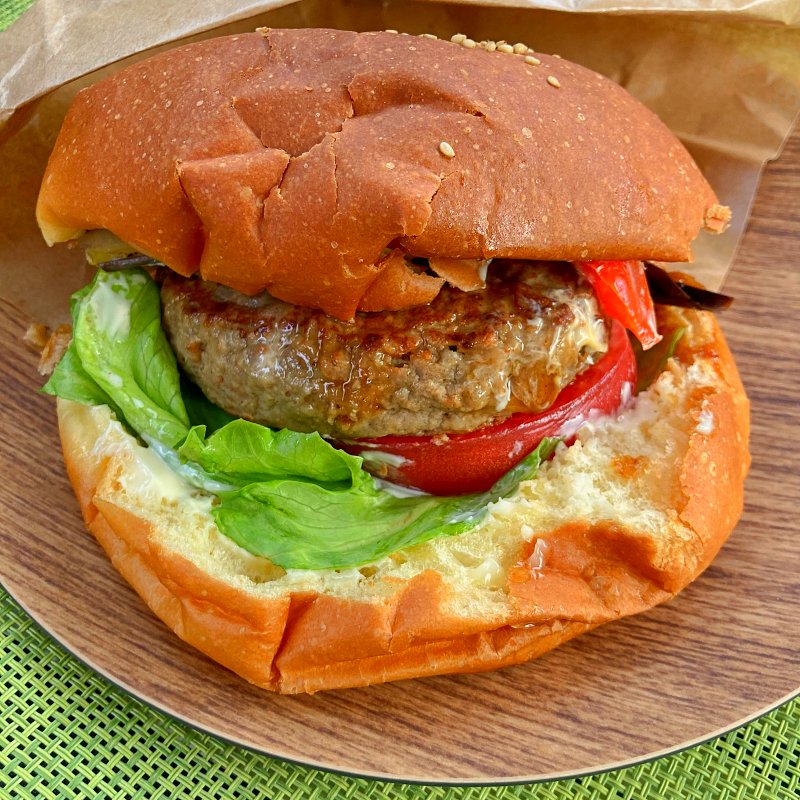 大きくて食べ応え十分なハンバーガー。生地はブリオッシュ寄りのほんのり甘みのあるふわふわバンズ。どっしりとしたパテ、レタス、パプリカ、トマト、そして茄子のソテーがサンドされています。玉ネギたっぷりの爽やかな酸味のオリジナルソース。満足感ありあり。