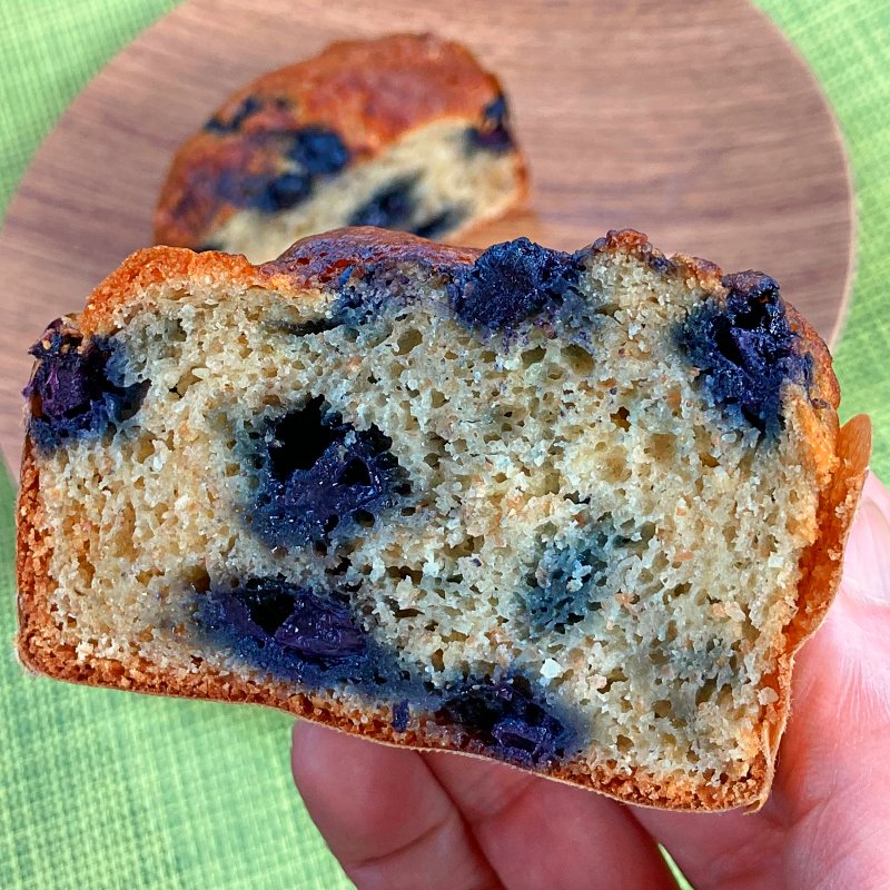 ドライフルーツではなく生のブルーベリーがたっぷりのふんわりマフィン。生地はワイルドで、甘さ控えめ。