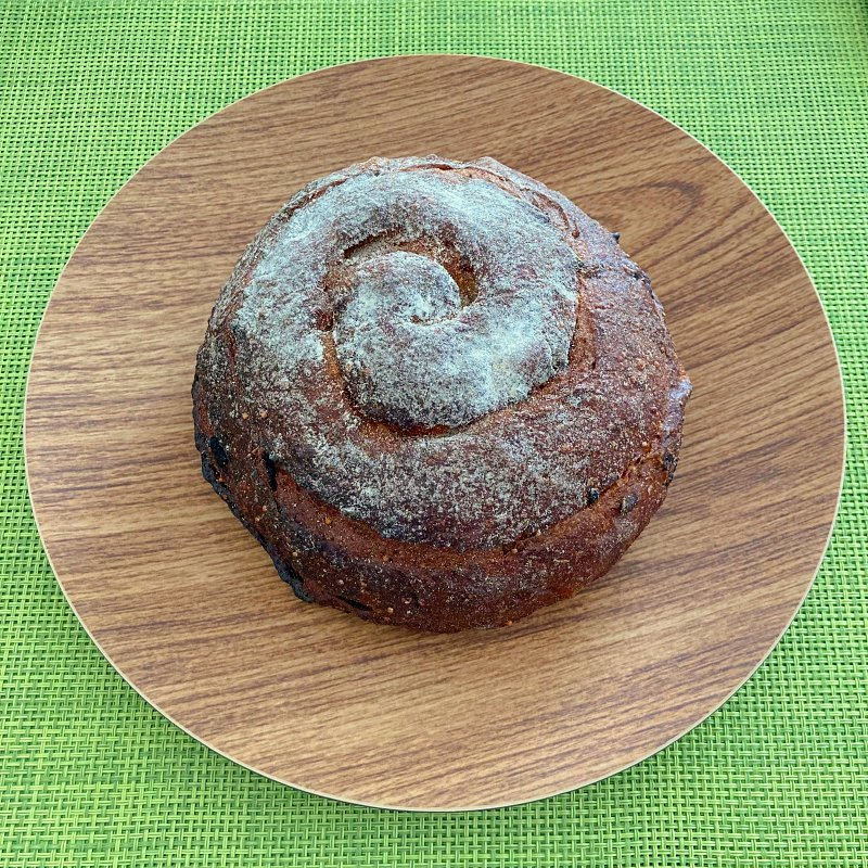 石臼挽きの全粒粉を使用したサクッとした生地。デーツは砂糖代わりになる栄養価の高いフルーツ。赤いイメージがあるのでカットしたら赤いかな?と思ったら、ブラウンでした。細かく刻まれたいちぢくが練り込まれていて、パリパリと音がするくらい種の食感あり。素朴なおいしさ、パクパクと食べ続けてしまうパン。