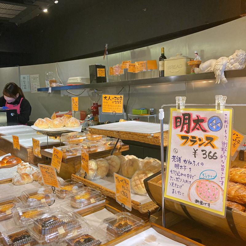 人気商品。出来立てをレジで直接受け取り。大きい!老舗かねふくの明太子がフランスパンの中にたっぷり入ってます。パン生地はやわらかくて、小麦のかおりが香ばしい。ガーリックも効いた、ほんの少しピリ辛な明太子。シソ?もペーストに混ざっています。これは…うまい!