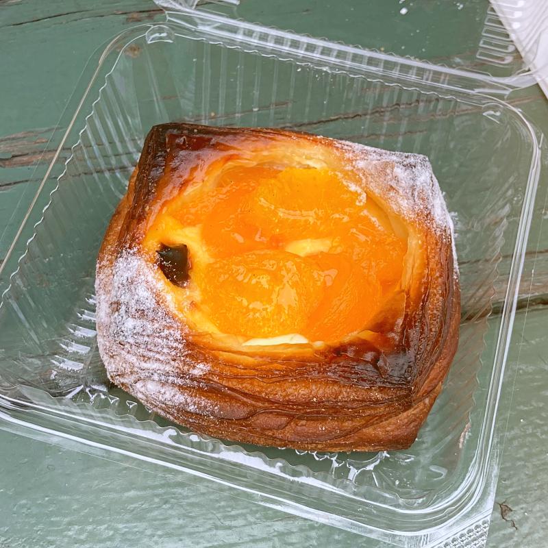 杏とオレンジのデニッシュ。しっかりめに焼きあがったパリパリ&厚めのデニッシュ生地に、白ワインやリキュール、バニラと煮込んだ杏とオレンジ。クリームエペス(クリームチーズのような味)とカスタードクリームが入っています。甘酸っぱいフルーツとクリームが結構合う。