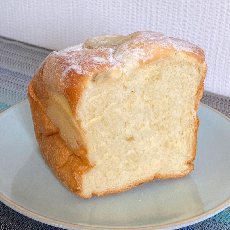 ハーフサイズをお持ち帰り。トツゼンベーカーズキッチンの看板商品。完熟したバナナ、卵、バターをたっぷり使用したふんわり焼き上げた食パン。スライスして食べてみる。絶妙なバナナ感。 しっとりやわらかいクラム。「幸せの」と名づけるだけはある逸品。