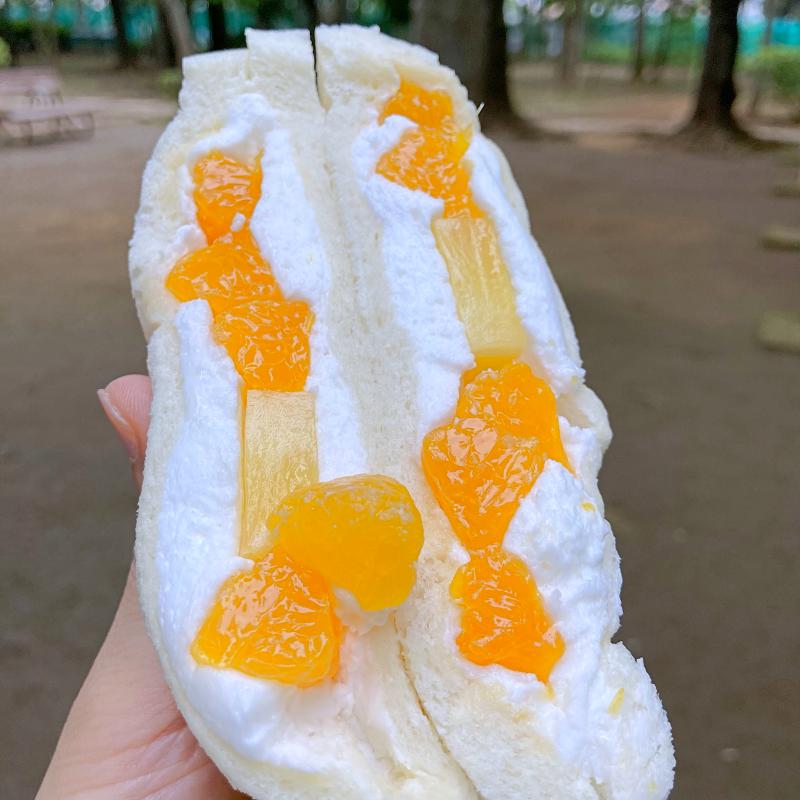 こちらも全然パンに収まっていない(笑)。たっぷりホイップクリームがホワホワです。メレンゲがはいってる?持ち運んでもダレないようにかな。意外とさっぱりシロップ漬けのパインとみかんがゴロゴロ。甘い系もばっちりおいしい。季節によってはイチゴもあるみたいです。