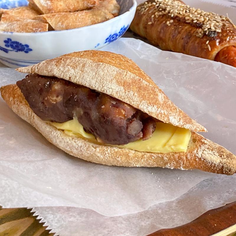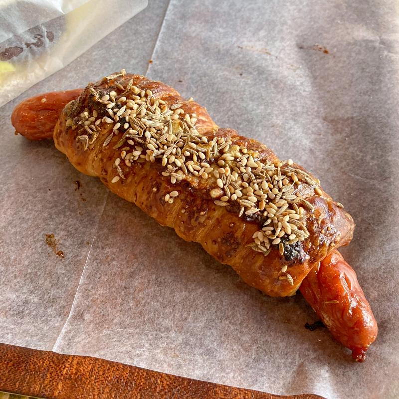 沖縄にある自家製ハム・ソーセージ専門店「TESIO」のジューシーなソーセージを使ったパン。粒マスタードや七味、チーズもロールされてるオトナなお味。パンの上にはクミン、ごま。これはビールと一緒に食べても最高かと。
