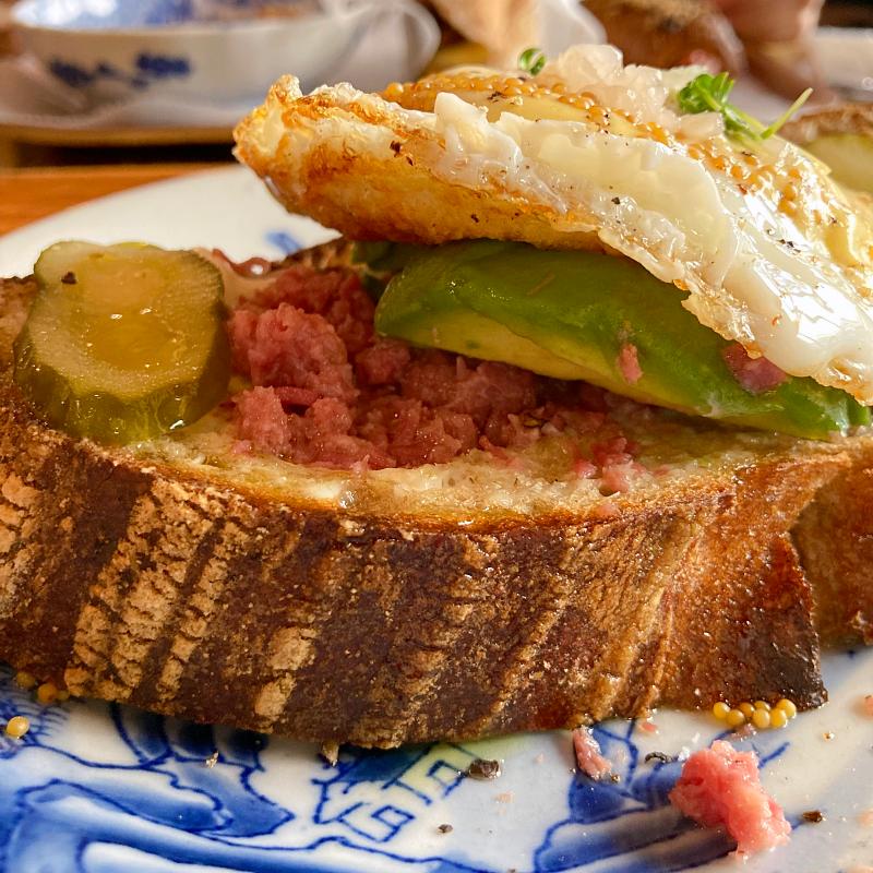 お店の代表作「ブリコラージュブレッド」に乗っているのは、前述のTESIOのコンビーフ、厚みのあるアボカド、ピクルス、ポーチドエッグにオランデーズソース。自家製マスタードの酸味が効いていてさっぱり。