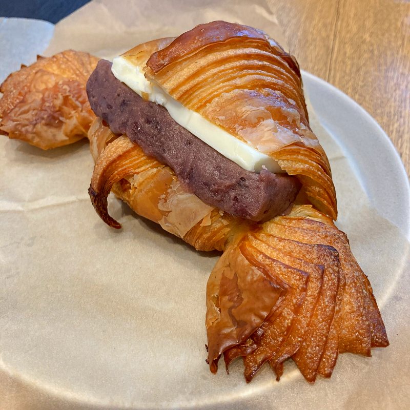 売り場のおすすめNo.1のPOP。人気商品。形がカニみたいな塩気がしっかりしたクロワッサンに、5mmはあるブ厚い無塩カルピスバターと、かなりなめらかでクリーミーなつぶあんが挟まれている。パリッパリのクロワッサンとのバランス、おいしい。