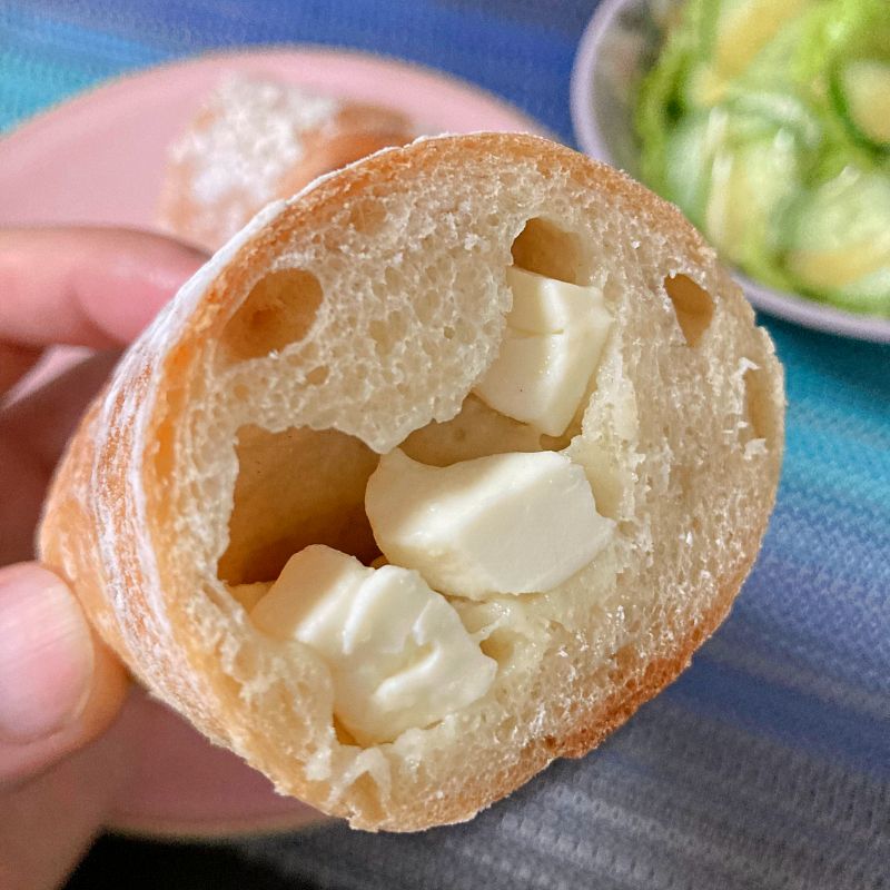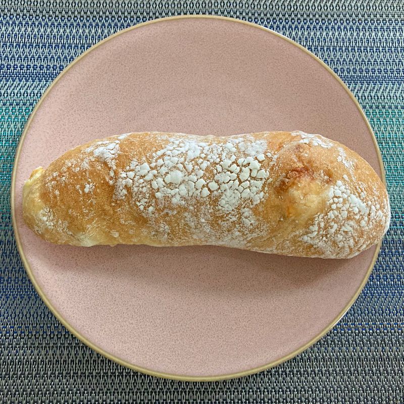 歯切れのよいソフトフランスの生地に、ヤギのチーズが入っています。 酸味はないので苦手な人も大丈夫。素朴な味わい。原材料もシンプルで、小麦粉・塩・イースト・チーズのみ。 一緒に食べたゆで卵とも相性よかったです。ワインなどにも合いそう。