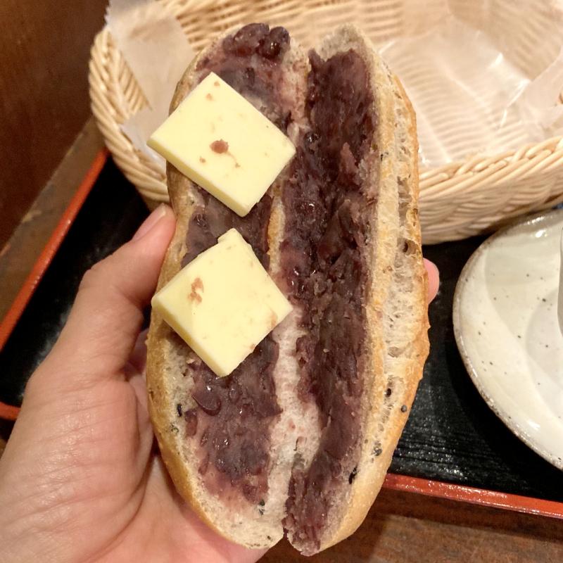 特別栽培の小豆を使った粒あんと有塩のよつ葉バターが五穀フランスパンに挟んであります。パッカーンとひろげてみました。もう1切れバターがあってもよかったような…五穀フランスは 音が小気味よく聞こえてくるくらいパリッと堅めで歯切れ良い。ほっくりとした粒あんと有塩バターのハーモニー♪ バランスが良かったです。