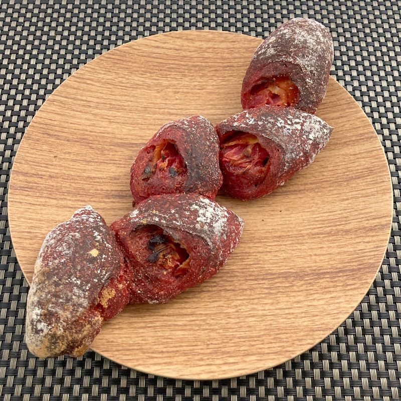 エピはお持ち帰り。色鮮やかなビーツを練りこんだ生地でベーコンと玉ねぎを包み込んだエピ。クラムが意外にももっちりとしていて弾力がある。ビーツの独特な風味に甘い玉ねぎ、塩気のあるベーコンの組み合わせに新鮮さを感じました。このエピは他では見たことないわぁ。