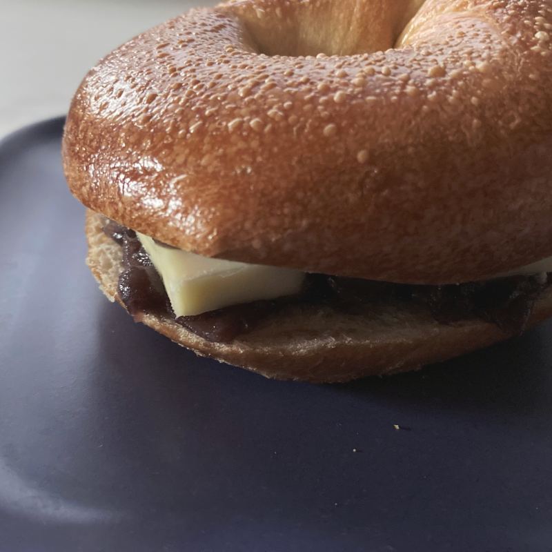 しっかりと焼かれているベーグルのクラストはパリッとしていて中身はもっちり。生地がギュっと詰まったベーグルです。おいしい。