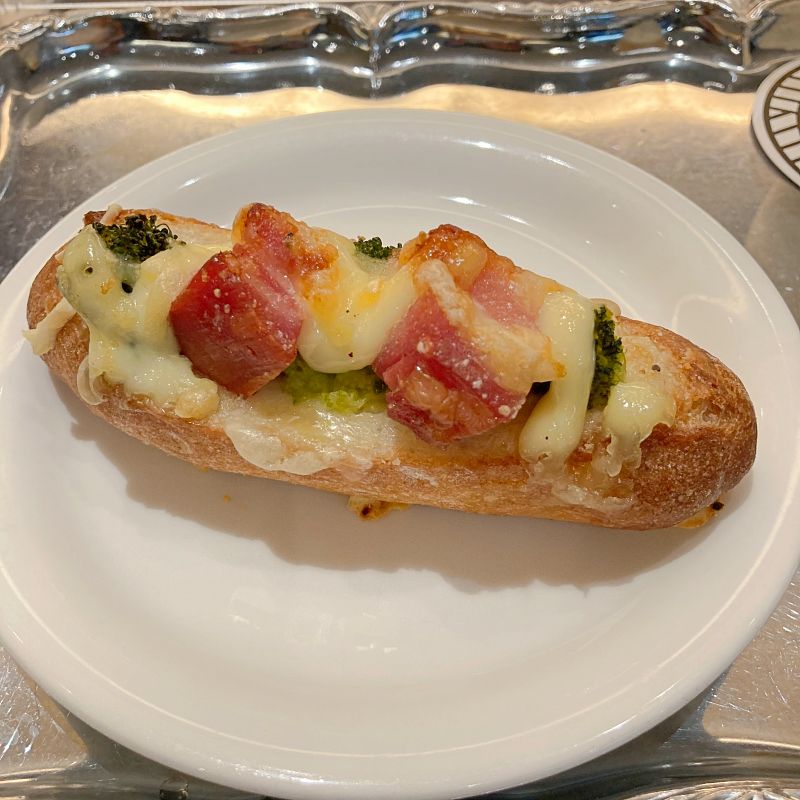 ゴロッと大きめのベーコンブロックがふたつ。ブロッコリー、チーズ、マヨネーズ。結構ハードなフランス生地でバリバリとした噛みごたえ。上に乗っている具材がしっかり味がついているのと対照的に、パンはトラディショナルな味。
