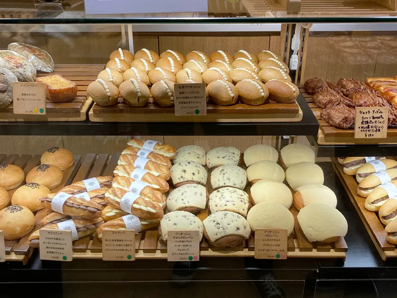 ガラスケースに綺麗にならぶパン。対面式で店員さんに取ってもらうスタイル。小ぶりのパンが多め。