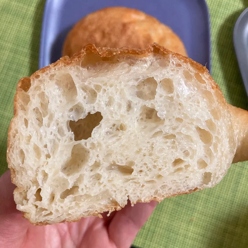表面が軽くパリっとする程度に軽くリベイク。クラストが薄くて小麦の香りが心地よい。中は高加水でかなりもっちりとした仕上がり。表面と内側の食感のコントラストが絶妙。塩気はなく自然な甘みだけだが、何もつけなくてもパクパクと食べてしまうおいしさ。
