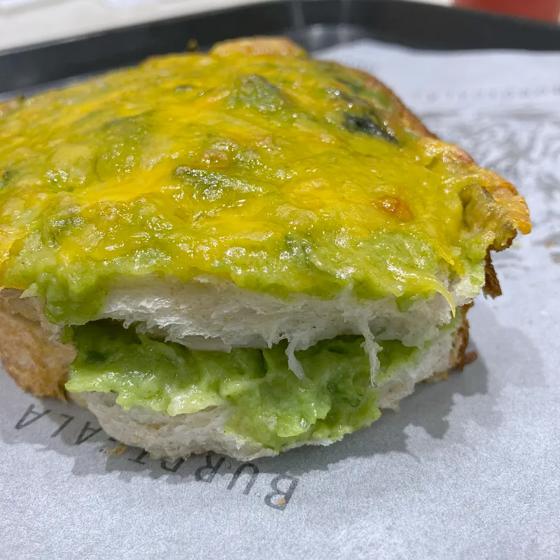 天然酵母のルヴァン種を使った人気パン「ルヴァン・ナチュール」に、ほうれん草のベシャメルソースとレッドチェダーチーズ、スライスされたベーコン。トースターがあったので少しリベイク。パンがシンプルにおいしい。