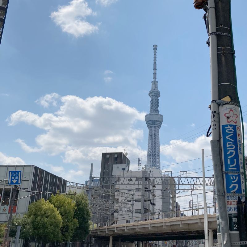 場所は東武スカイツリーライン・曳舟駅から徒歩12〜3分くらい。電車から降りるとスカイツリーがどこからでもよく見えます。上の写真は駅から歩き始めに撮影。古い建物も多く、下町の情緒を残した街並みで、結構楽しく歩いて行けました。
