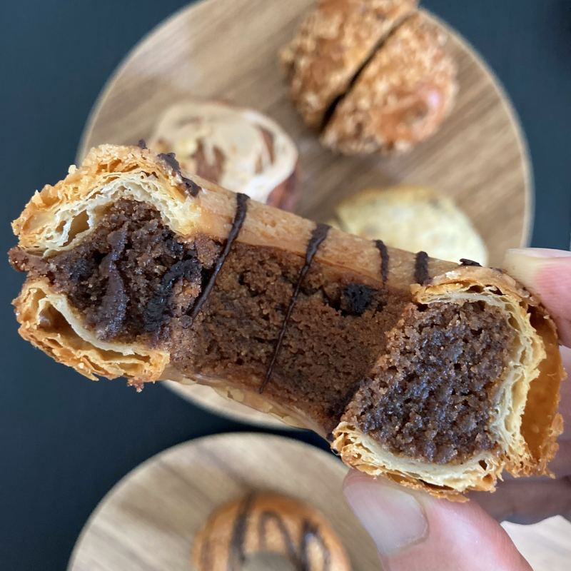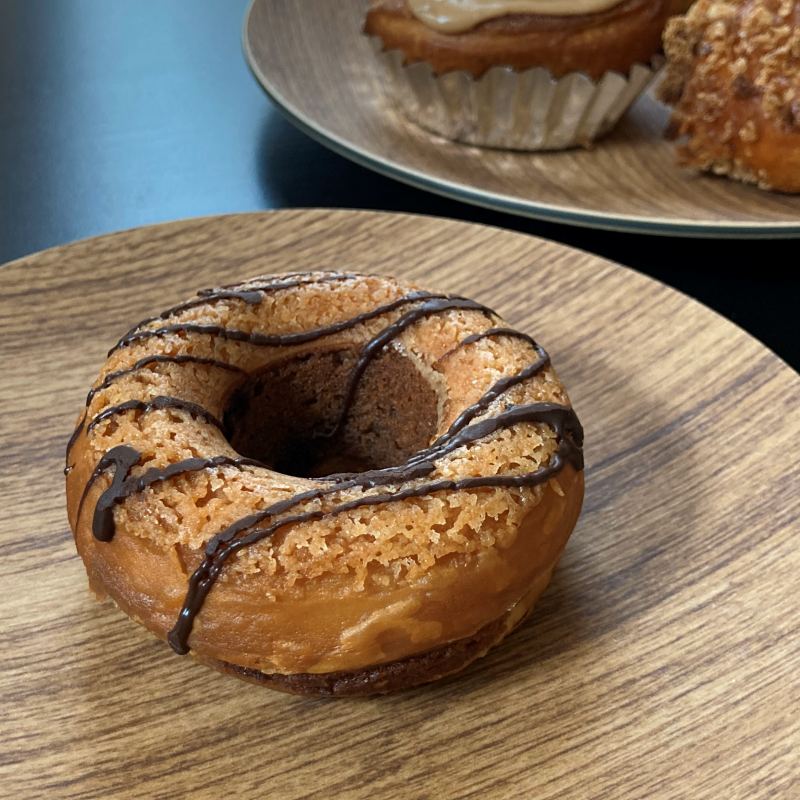 人気商品。CALVAオリジナルの焼きドーナツ。外側は薄いクロワッサンの生地にカリッとしたパートシュクレ(タルト生地)を重ねて焼いていて、内側にはチョコレートのクリームとチップが隙間なく入っています。