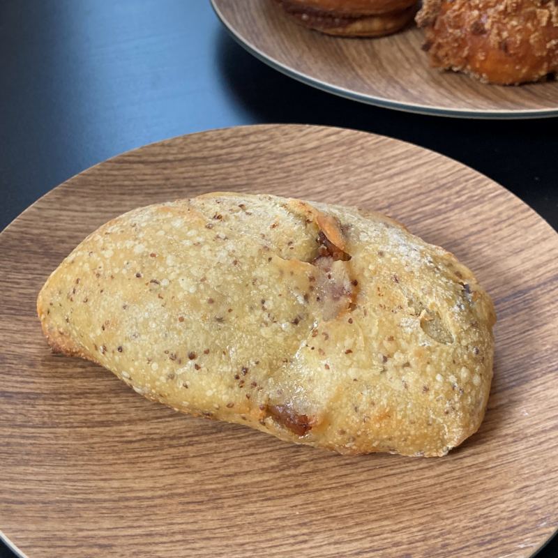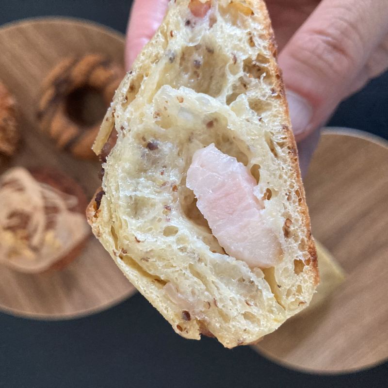 小麦、セモリナ粉、オリーブオイルをミックスしたむっちり生地のチャバタ。粒マスタードと厚めのベーコンが練りこまれています。