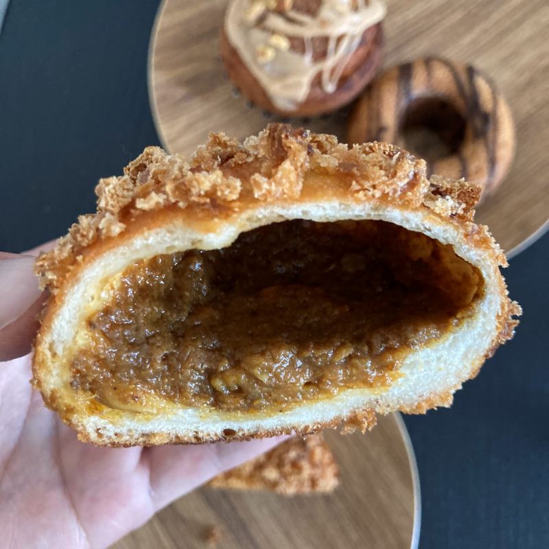 注文が入ってから揚げてくれる、出来立てを楽しめるカレーパン。うれしいなぁ。表面には粗めのパン粉がかかっていて外はザクザク、パン生地は薄め。カレーは北鎌倉のフレンチレストラン『シェ・ケンタロウ』のシェフと作った特別なフィリング。
