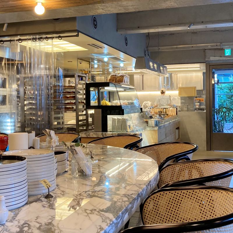 全体的にシンプルで落ち着く店内。海外では家族や友人たちとお店で朝食をとる文化があり、日本でも広めたいというオーナーの想いがこめられた店作り。カフェスペースは広め。キッチンを囲むU字型のカウンターとテーブル2卓、どちらも白ベースでマーブル調の大理石でした。