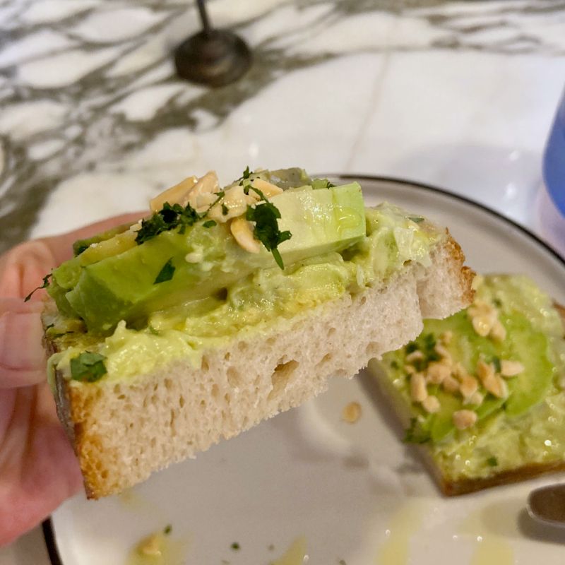 ルヴァンとサワーの2種類の種を使ったサンフランシスコスタイルのサワードゥ。その上にライムの効いたアボカドのスライス、スパイシーなワカモレがたっぷり、さらにアーモンドが降りかかった一品。
