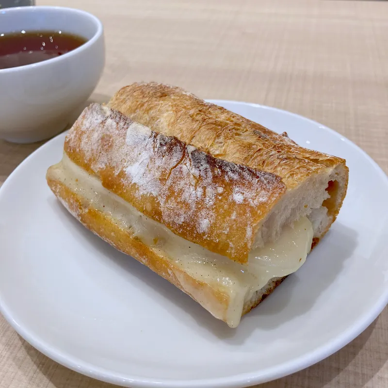 バゲットトラディションにヤマト豚のハムとスイスのグリュイエールチーズをはさんだシンプルなサンド。溶けたチーズの旨みが良い。チーズでハムが見えてませんが…数枚重なっていました。