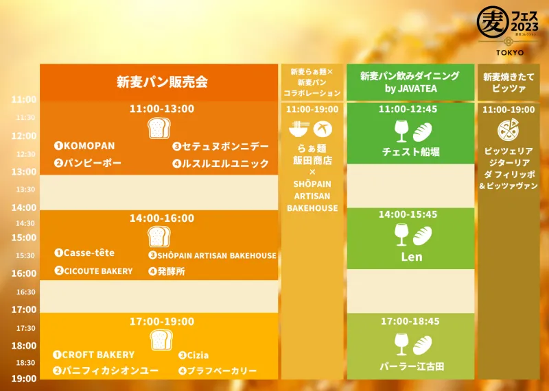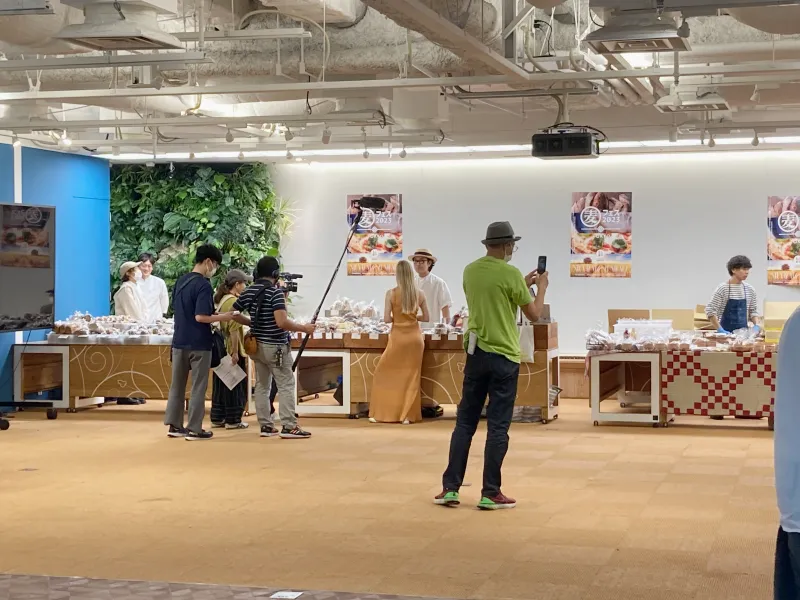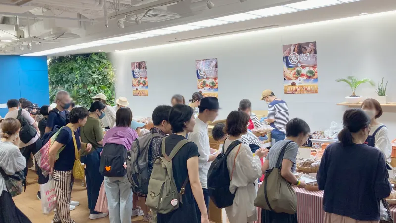 「麦フェス in TOKYO」の会場は、大手町駅から徒歩1分のENEOSビル1Fのイベントスペース。「新麦パン販売会」「新麦らぁ麺 × 新麦パンコラボレーション」「新麦パン飲みダイニング」の3パートでの構成です。加えてビル横のテラスで「新麦焼きたてピッツァ」の提供もあり。