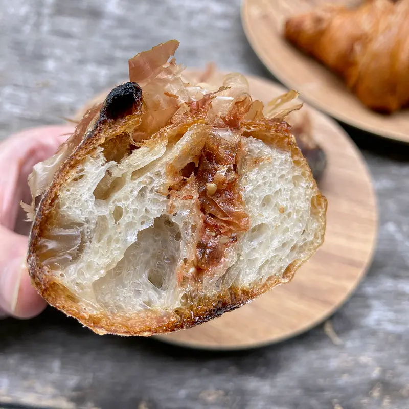 フランス産発酵バターを練り込んだ生地の内側はモチっとしています。甘み・塩味が強すぎず、ちょうどいいバランス、ニュートラルなおいしさ。先端の焼き上がり感がたまらない。