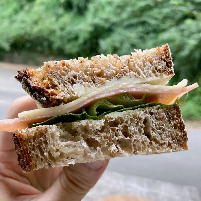 想像よりもずっとしっとり、ハチミツ入りで粘り気は少ない生地、皮薄め。蕎麦の実がたくさん練り込まれていてとっても風味あり。ハム、チーズ、レタス。マヨネーズなどは使っておらず、その分パンの旨みをしっかり味わえる一品。他のカンパーニュサンドも食べてみたくなります。