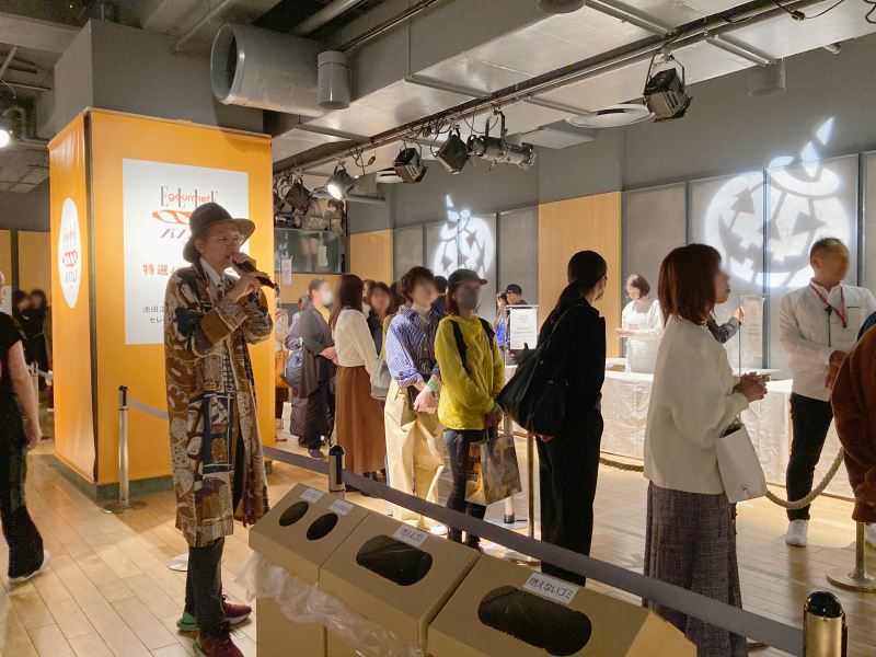 スナフキンのようなおしゃれなパンラボ・池田さんを発見。会場の案内や各店のシェフにライブインタビューを実施していました。お店やパンについての知識が深まるやりとり。かぼちゃのライトもかわいい。