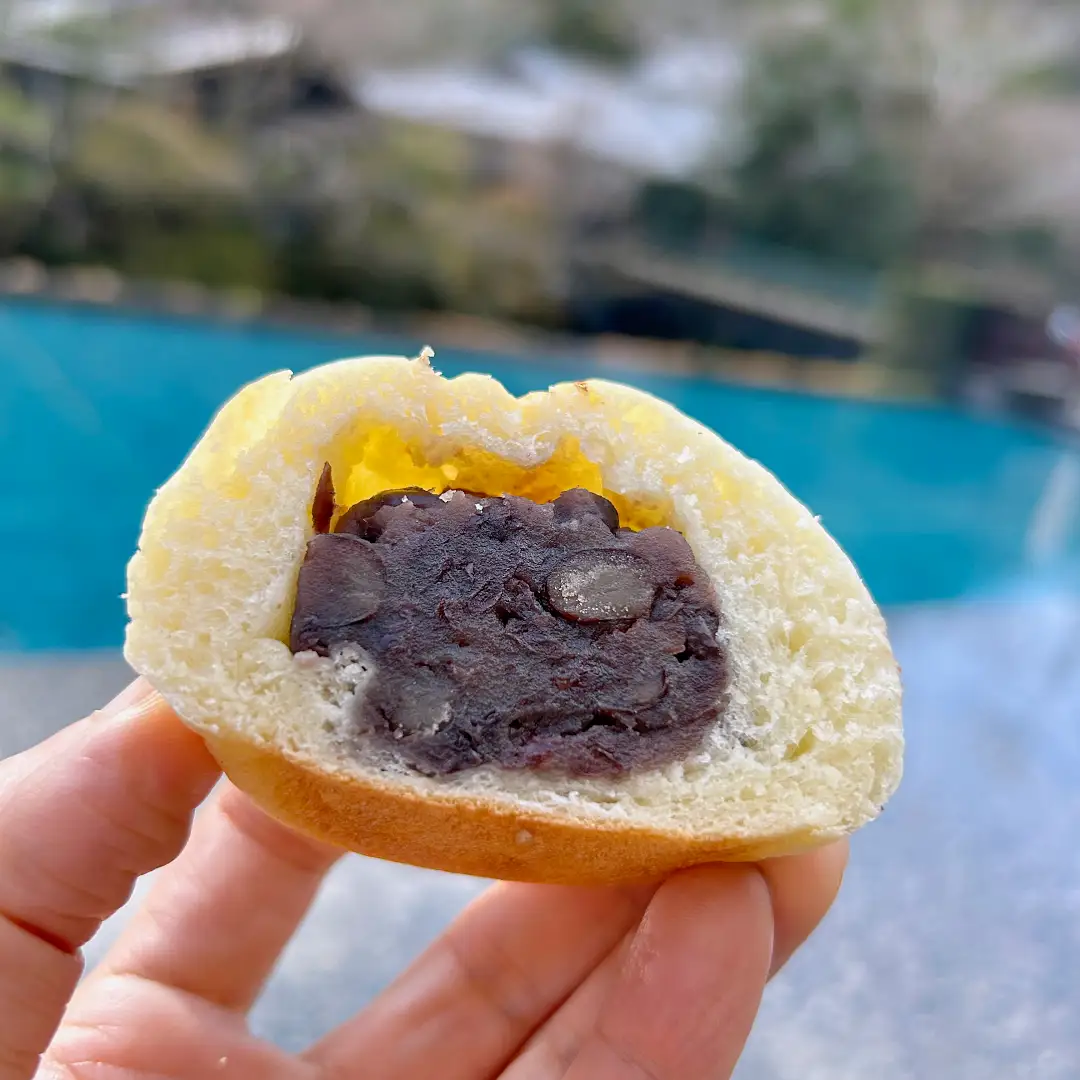 足湯につかりながら、景色を眺めてゆったりとパンを楽しめるベーカリーカフェ。風は冷たかったですが、足湯でからだがポカポカ。いや〜、癒されました。