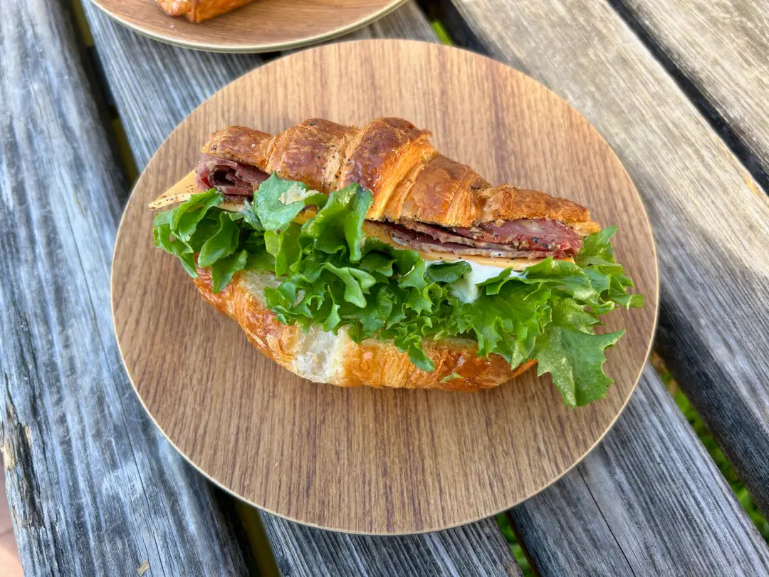 パストラミとチェダーチーズのクロワッサンサンド。バターたっぷり、大きめのクロワッサン。よく焼かれていて、バリっとした食感がサンドによく合う。黒胡椒が効いてる。グリーンリーフ(かな)が何枚も挟まっていて全体の調和が取れた一品。満足感高め。