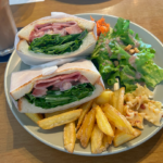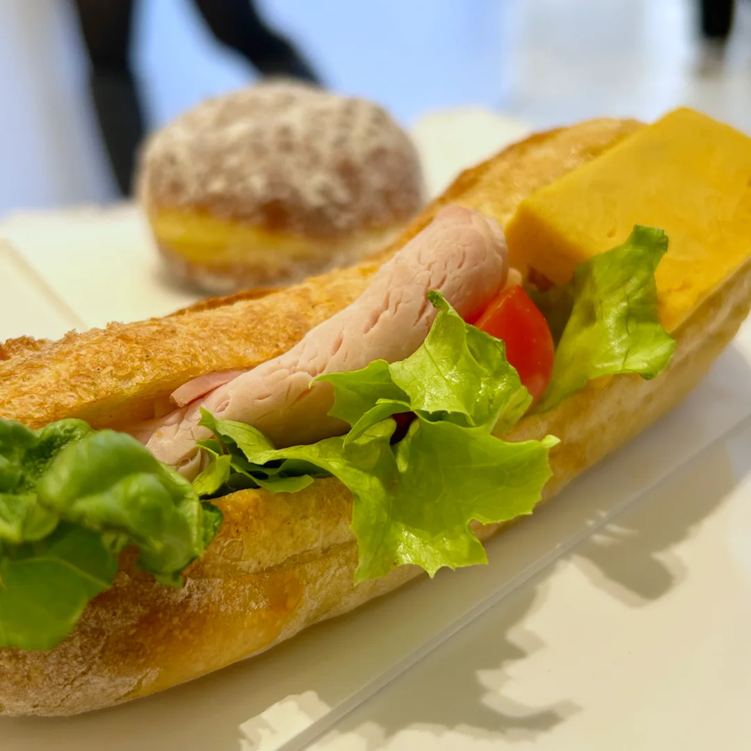 歯応えがあってヒキがあるミニバゲットに、モモハム、レタス、ミニトマト、そして淡い甘めのだし巻き卵。全体に合わせるようにあっさりめのマヨネーズ味。ハムがやわらかくておいしい。
