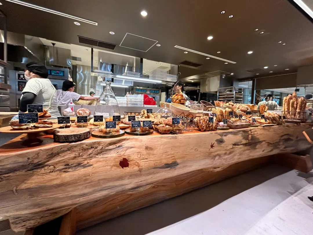 パンの国際大会「モンディアル・デュ・パン」で日本人初の総合優勝・世界一となった大澤秀一さんが代表を務めるベーカリー「Comme’N TOKYO」。定番のクロワッサンやバゲット、おすすめのクリームパンなど菓子パン、麻布台ヒルズ店限定のパンなど、素材にこだわった常時80種類以上が並ぶカウンター。お目見えするまで30分くらい並びました(汗)。本店の店作りも相当こだわった話を聞いたことがあるので、きっとこの大木のカウンターも厳選したんだろうなぁ。