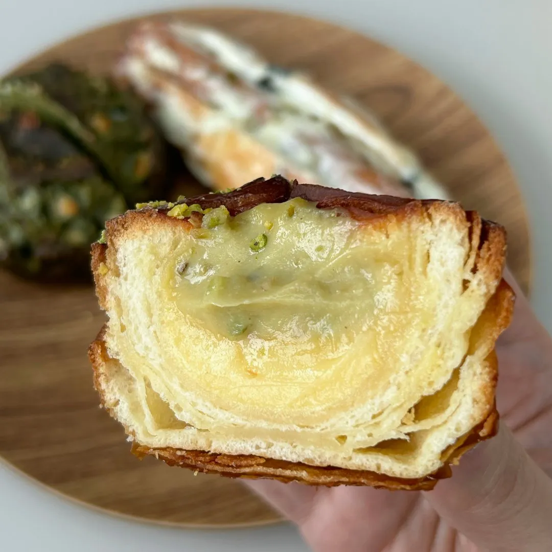カスタードクリームと、マスカルポーネで作ったピスタチオクリームが入ったデニッシュ。繊細な薄さのパリパリ食感デニッシュの土台、内側はしっかりめに焼き上がっています。カスタードが沁みてしっとりしている部分は食感の変化が楽しめました。砕いたピスタチオがパラパラと。