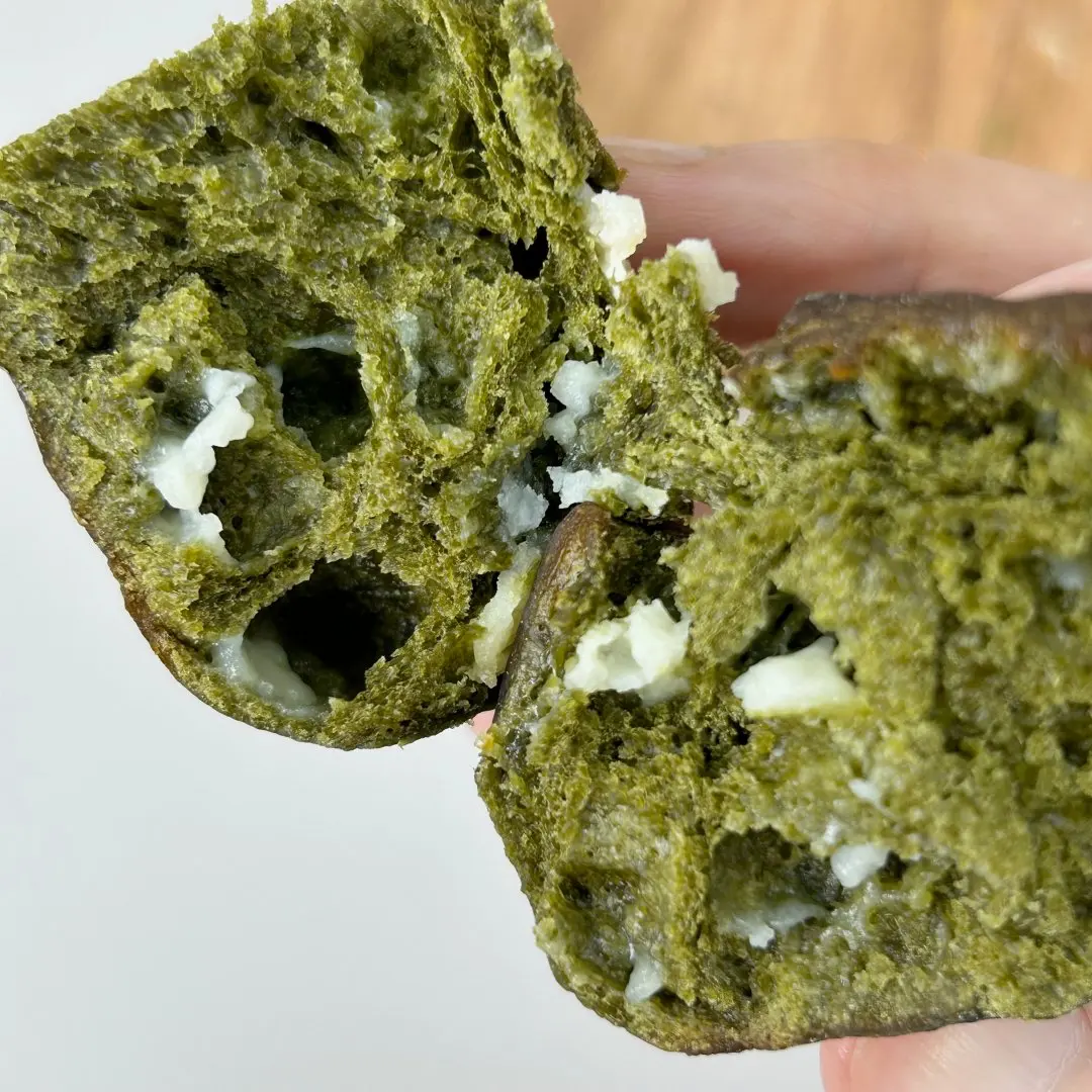 スコーンとパンの間の食感。外側はしっかりめに焼かれてます。ほろ苦い抹茶に、溶けたホワイトチョコの甘さが混ざって、間違いない味の組み合わせに。
