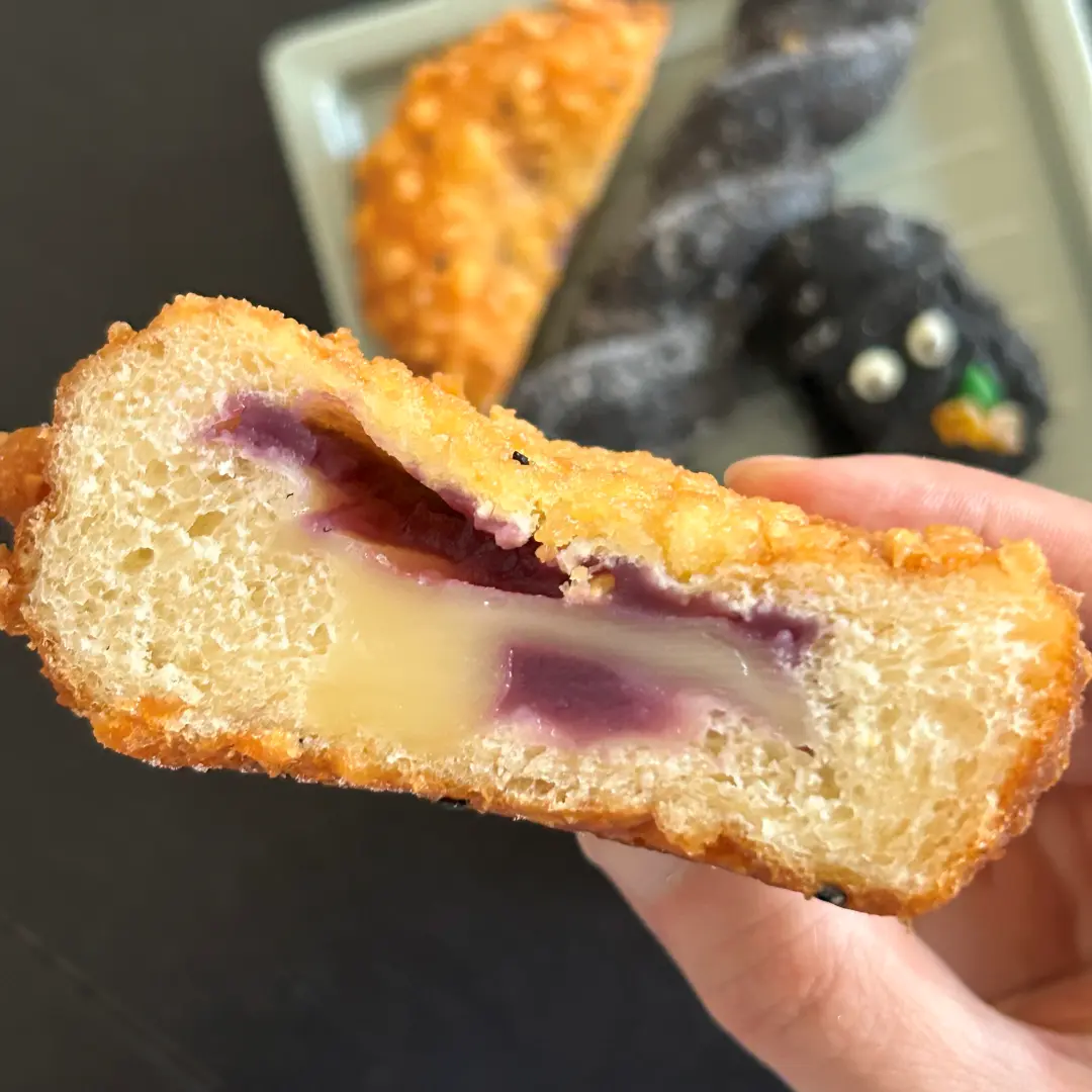 外にはザクザクとしたソボロ状になったクッキー生地をつけて揚げてあります。ジャンキーな感じのお味。紫芋クリームはしっかり甘く、チーズの塩味と絡んで甘じょっぱい味わい。チーズのトロっと伸びるのも楽しめます。きっと…もう少し温めればよかったかもしれません。少し油っぽいかな。