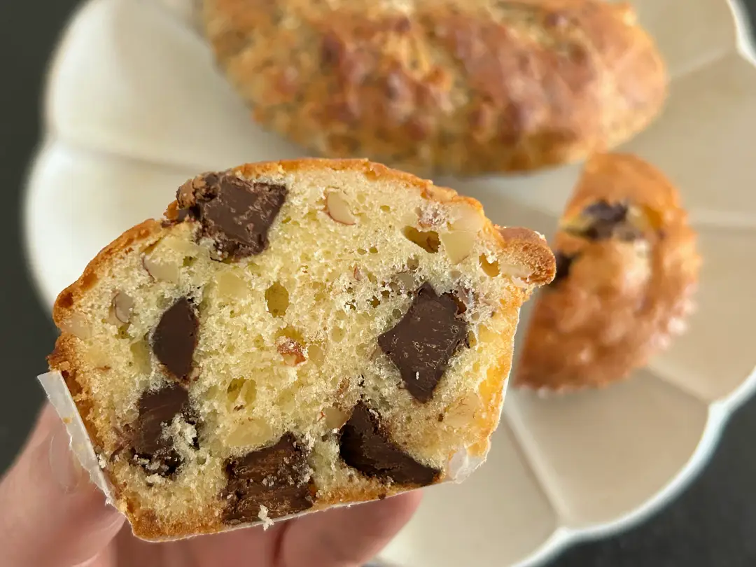 しっとりとしたマフィンに、カカオ70%くらいのビターチョコレートのブロックがゴロゴロ入っています。細かく砕いたナッツも入っていて、ほんのり塩味がチョコの甘さを引き立てておいしい。