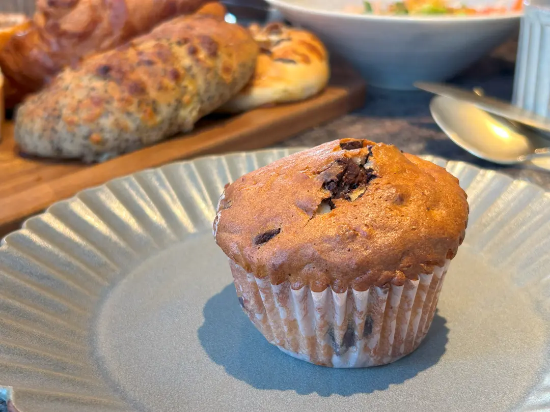 しっとりとしたマフィンに、カカオ70%くらいのビターチョコレートのブロックがゴロゴロ入っています。細かく砕いたナッツも入っていて、ほんのり塩味がチョコの甘さを引き立てておいしい。