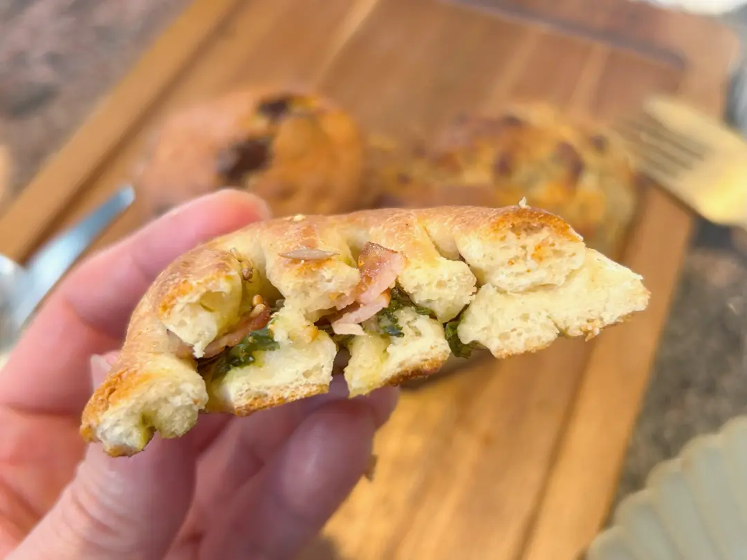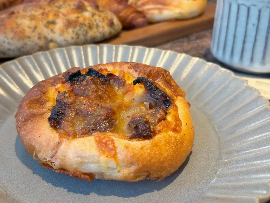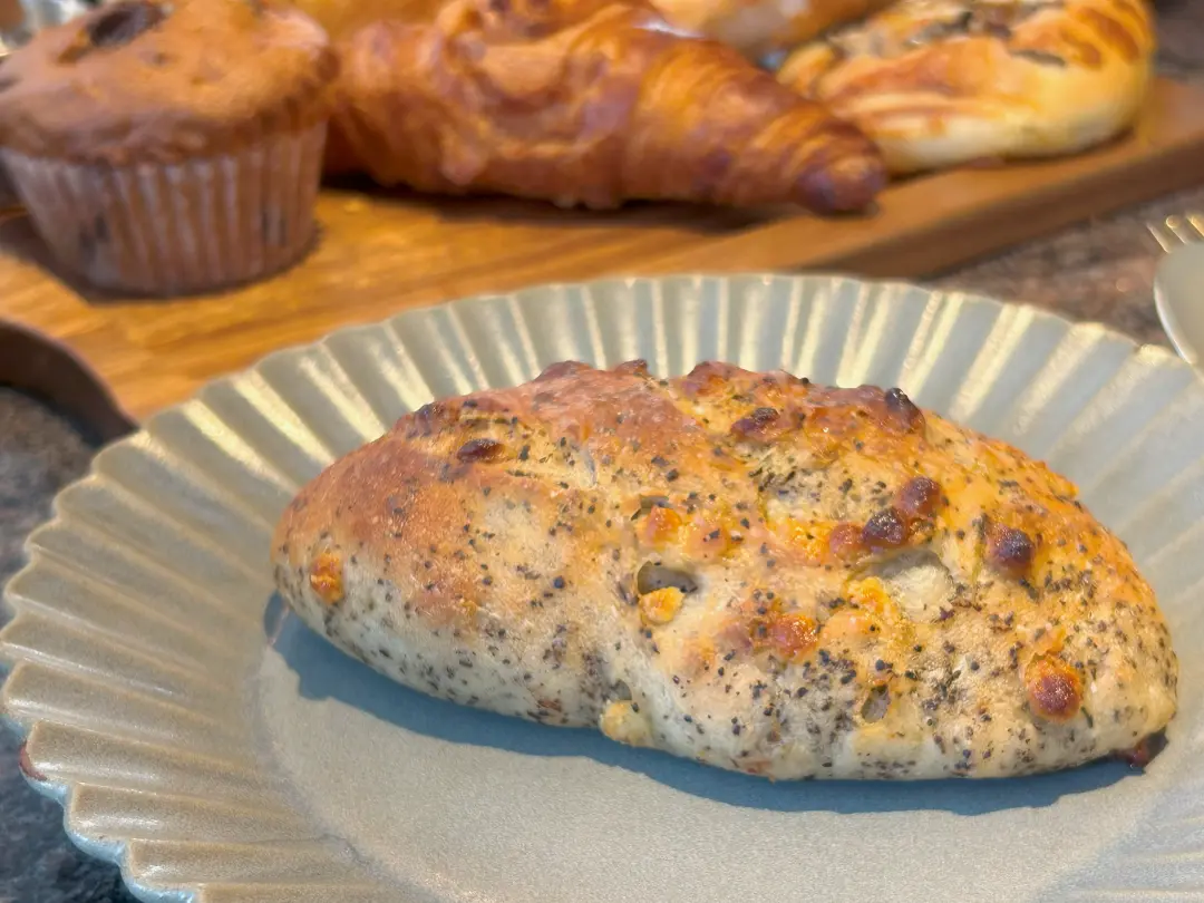 フーガスは南フランス・プロヴァンス地方の伝統的なパン。小ぶりのフーガスは、表面はヒキがあって、中はさっくりめ。水菜とベーコン、白胡麻。柚子胡椒が効いていてピリッとスパイシー。これはワインにも合う一品ですね。